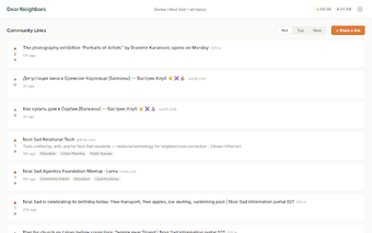 Dear Neighbors transforms the new tab experience in Chrome by providing a community-focused dashboard that showcases local news and participation opportunities. Users can customize their dashboard by selecting their country, city, and neighborhood, ensuring that the content is relevant and tailored to their specific area. The platform allows residents to browse links shared by their neighbors, with options to sort these links by popularity and recency. Additionally, it features tools for voting on the most useful links and sharing resources directly from any webpage through a convenient browser action popup.